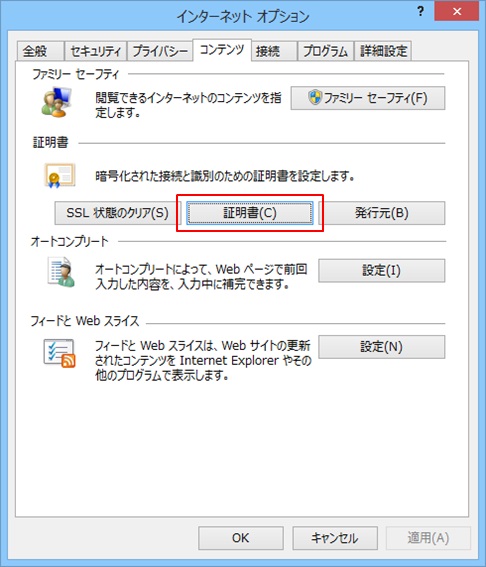 2 「コンテンツ」のタブから「証明書(C)」をクリックし、「証明書」画面を表示する。