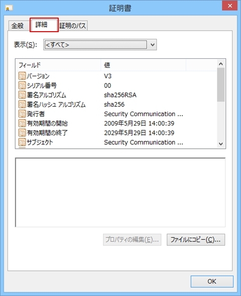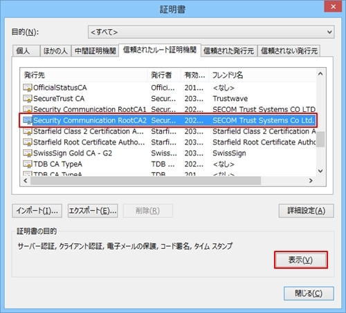3 「信頼されたルート証明機関」のタブをクリックし、発行先、発行者が「Security Communication RootCA2」、フレンドリ名が「SECOM Trust Systems Co Ltd.」となっている自己署名証明書を選択し、右下にある「表示(V)」ボタンをクリックする。