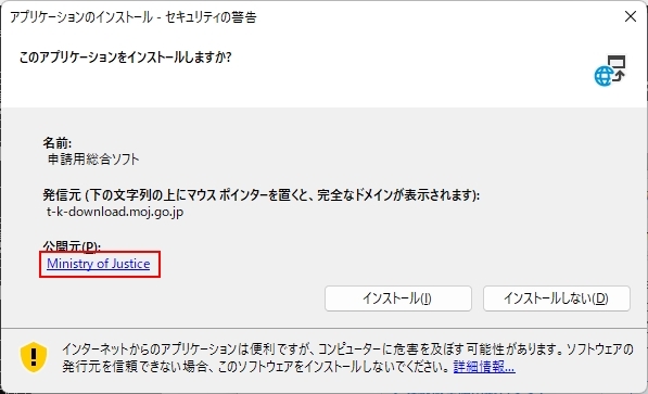 1 「アプリケーションのインストール」画面の発行元(Ministry of Justice)をクリックします。