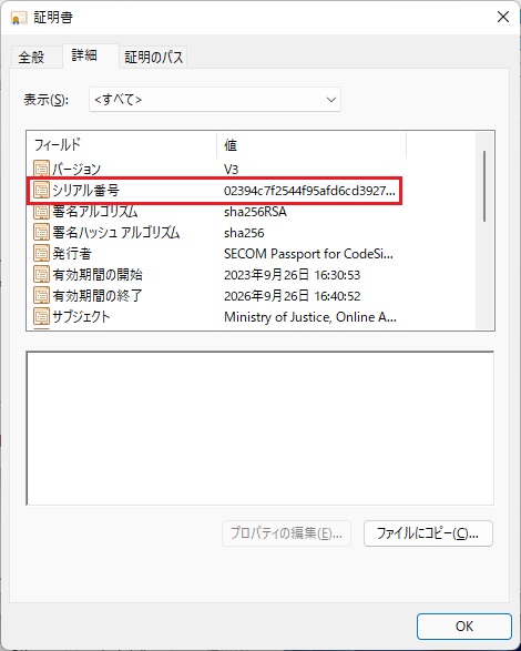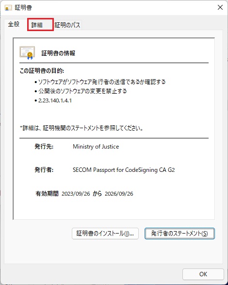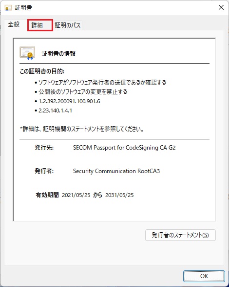 - ※「CN = SECOM Passport for CodeSigning CA G2、O = SECOM Trust Systems CO.,LTD.、C=JP」は、セコムパスポート for Web SR3.0であることを表したものです。