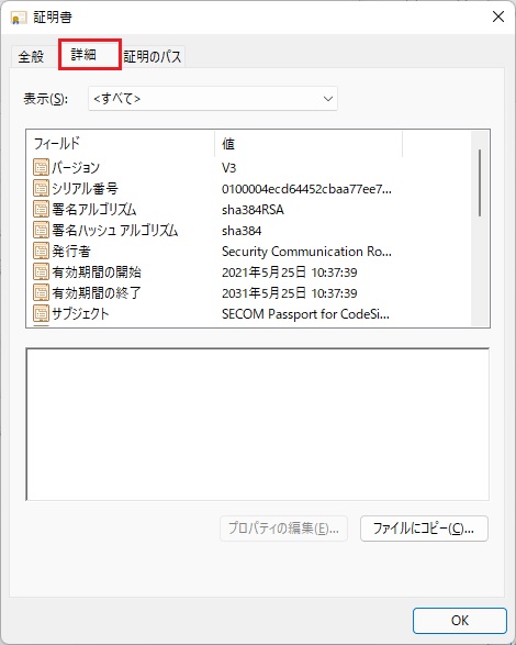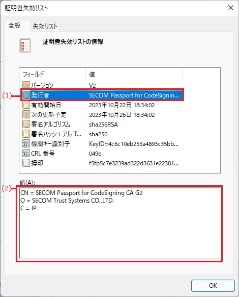 図の(1)部分をクリックし、「値(A)」の欄に「CN = SECOM Passport for CodeSigning CA G2、O = SECOM Trust Systems CO.,LTD.、C=JP」と表示されていることを確認してください(2)。