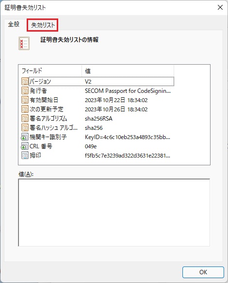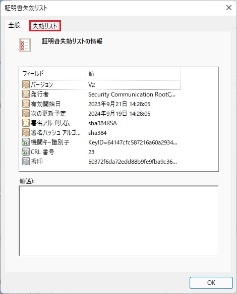 14 発行者を確認したら、「失効リスト」のタブをクリックします。