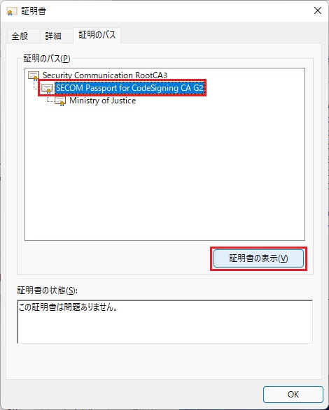 9 「SECOM Passport for CodeSigning CA G2」をクリックし、続いて「証明書の表示(V)」ボタンをクリックします。