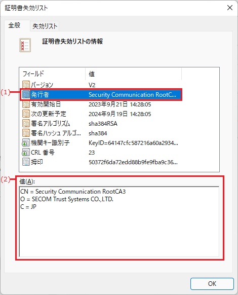 図の(1)部分をクリックし、「値(A)」の欄に「CN = Security Communication RootCA3、O=SECOM Trust Systems CO.,LTD.、C=JP」と表示されていることを確認してください(2)。