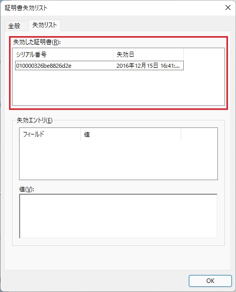 7 失効した証明書の一覧が表示されるので、「失効した証明書(R)」の一覧の中で、「3」で確認したシリアル番号が失効していないことを確認してください。確認後、「OK」ボタンをクリックし、画面を閉じます。