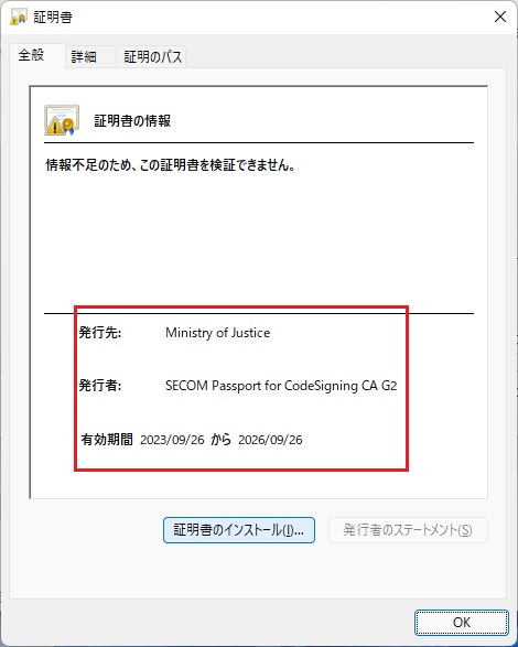 「アプリケーションのインストール」画面の発行元(Ministry of Justice)をクリックして表示される「証明書」画面において、「情報不足のため、この証明書を検証できません。」と表示された場合、発行先が「Ministry of Justice」、発行者が「SECOM Passport for CodeSigning CA G2」であることを確認いただければ、法務省の電子署名が付与されていることを確認することができます。