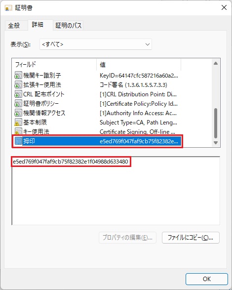 5 画面中央のフィールド項目から「拇印」を選択すると、証明書の拇印が画面に表示されますので、この値(フィンガープリント)が正しい値であることを確認します。