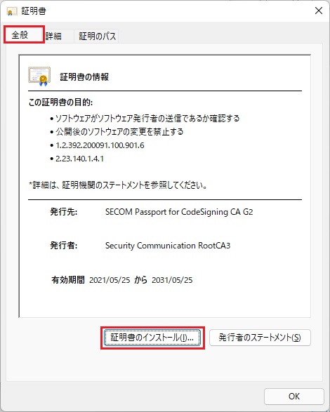 6 証明書の確認が終わった後、「全般」タブを選択し、「証明書のインストール」ボタンをクリックします。