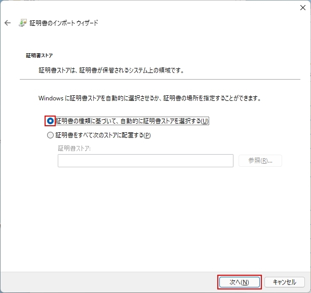 8 「証明書の種類に基づいて、自動的に証明書ストアを選択する(U)」にチェックして、「次へ」ボタンをクリックします。