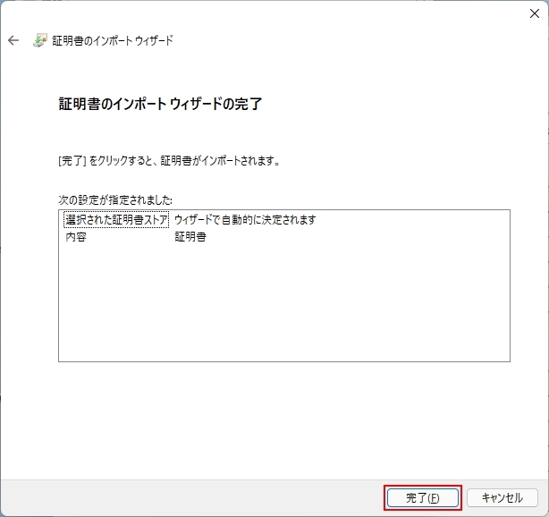 9 証明書が正しく登録(インポート)されると、完了画面が表示されますので、「完了」ボタンをクリックします。
