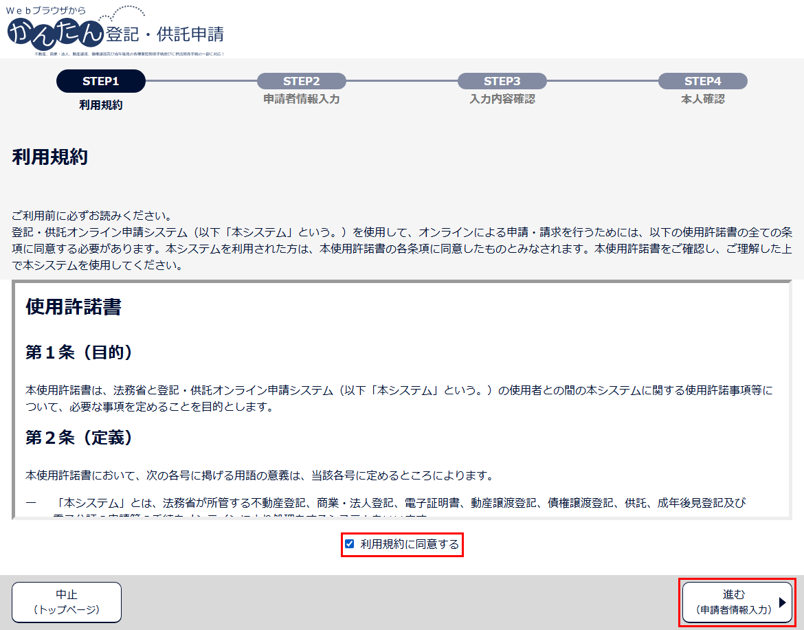 2 「利用規約」画面が表示されますので、登記・供託オンライン申請システムを利用する上での使用許諾書の内容を確認し、「利用規約に同意する」にチェックを入れ、「進む(申請者情報入力)」ボタンをクリックします。
