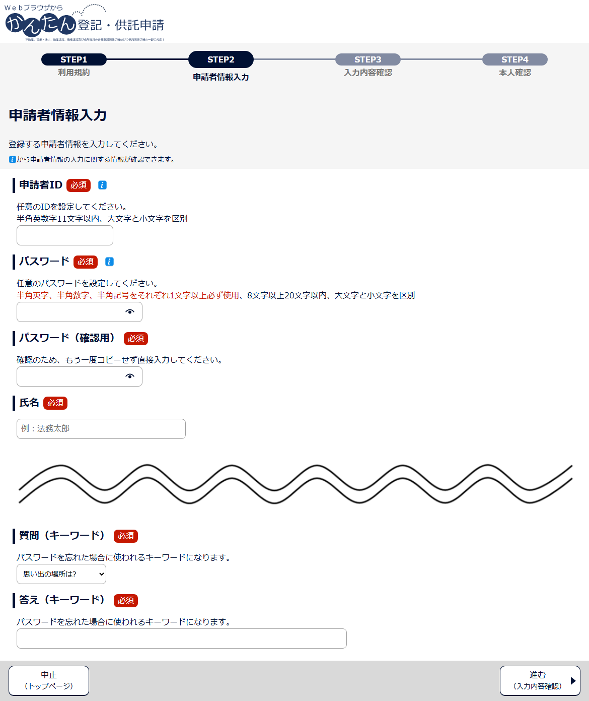 3 「申請者情報入力」画面が表示されますので、申請者情報を入力します。なお、申請者情報は、申請者IDを除き、登録後に変更することができます。