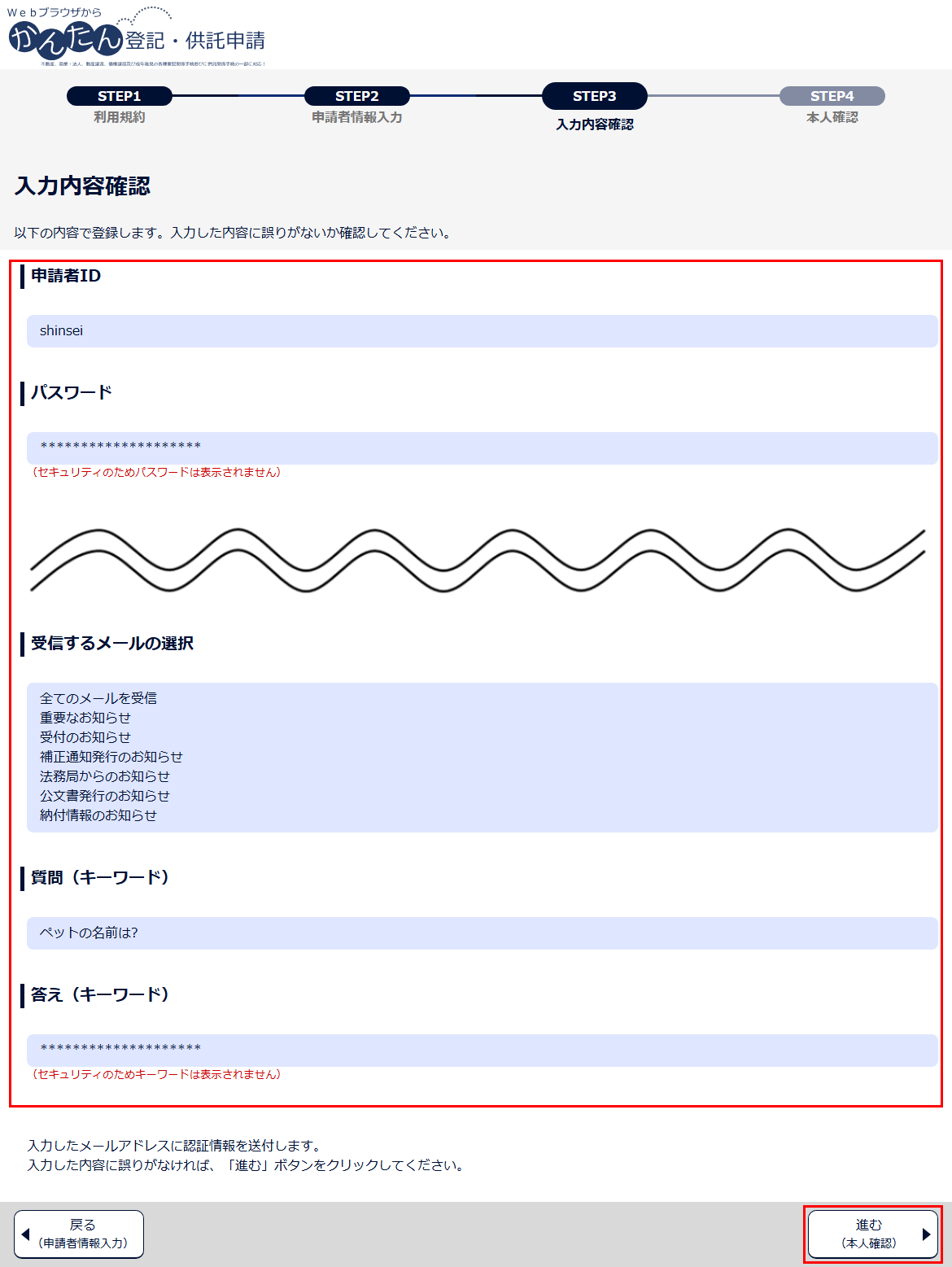4 申請者情報の入力完了後、「進む(入力内容確認)」ボタンをクリックします。