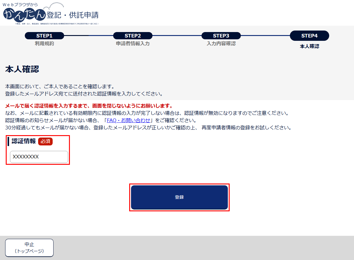 6 「本人確認」画面が表示されます。また、「申請者情報入力」画面の「メールアドレス」欄に入力したメールアドレス宛てに、「申請者情報登録用 認証情報のお知らせ」メールが送付されます。