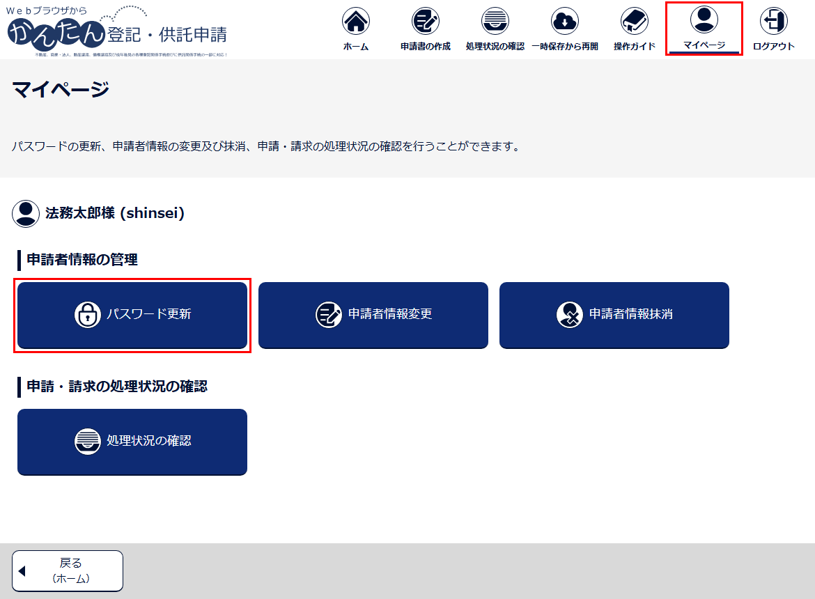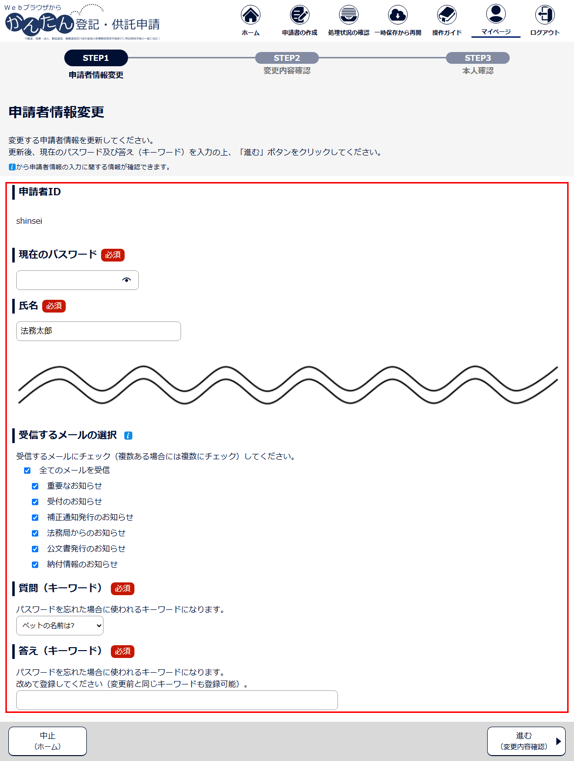 登録した申請者情報を変更します。申請者情報の変更を行う場合には、事前に、登記・供託オンライン申請システムにログインする必要があります。