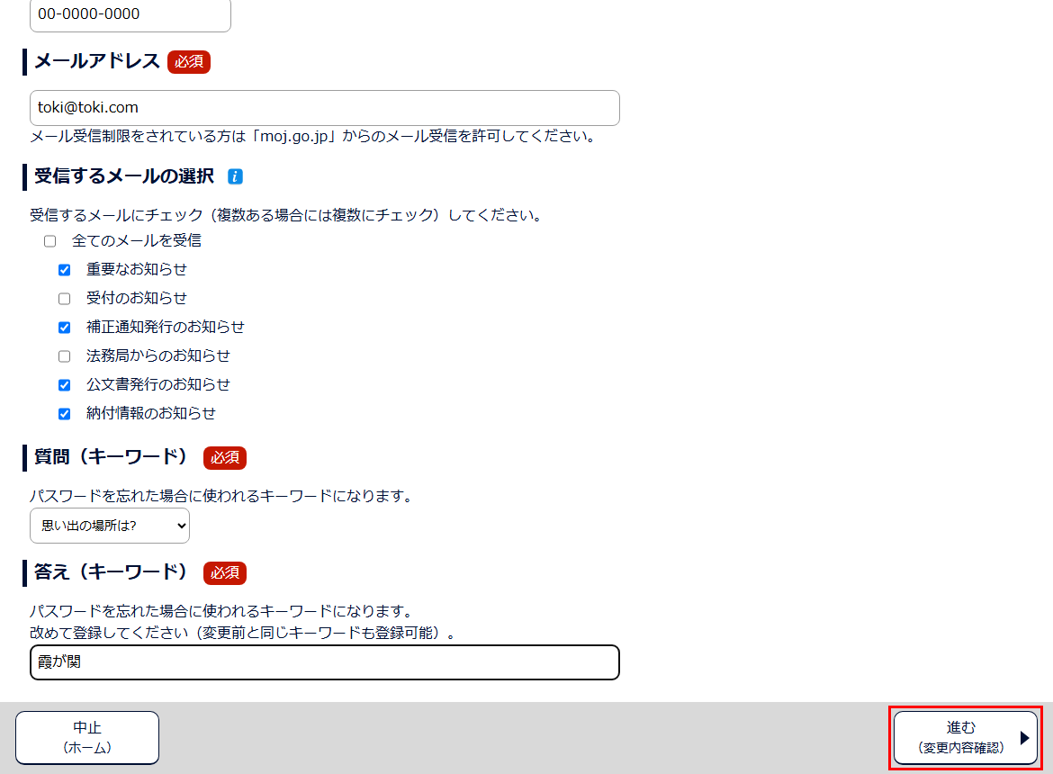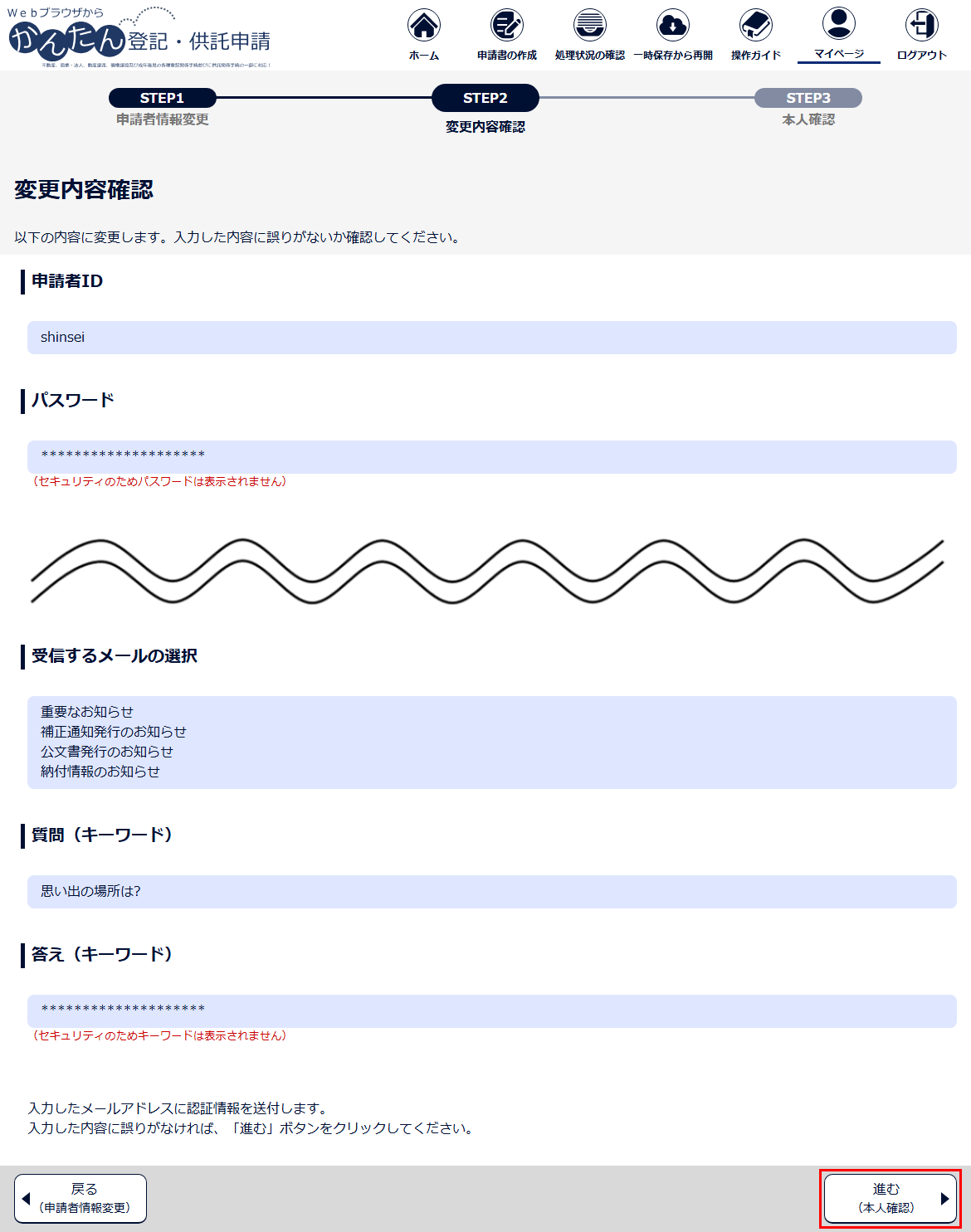 3 申請者情報を変更した後、「進む(変更内容確認)」ボタンをクリックします。