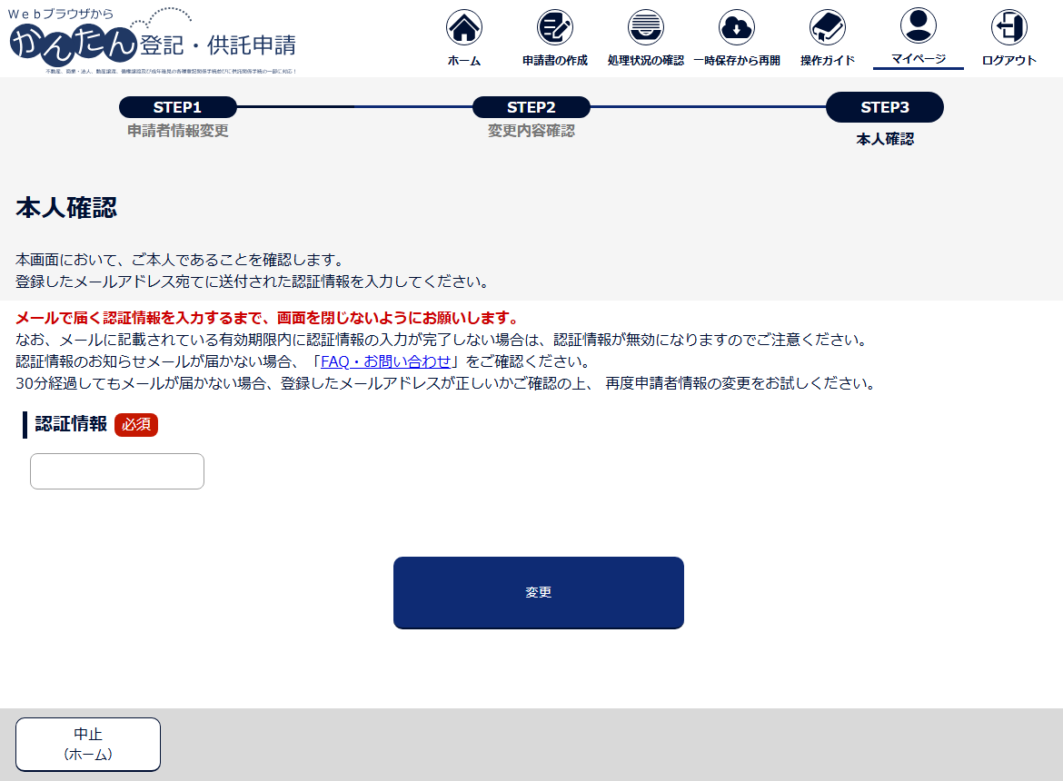 このとき、「申請者情報変更」画面の「メールアドレス」欄に入力したメールアドレス宛てにメールが送付されますので、ご注意ください。