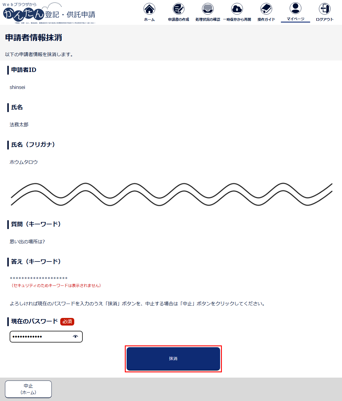 2 「申請者情報抹消」画面が表示されますので、抹消する申請者情報が正しいことを確認後、現在のパスワードを入力し、「抹消」ボタンをクリックします。