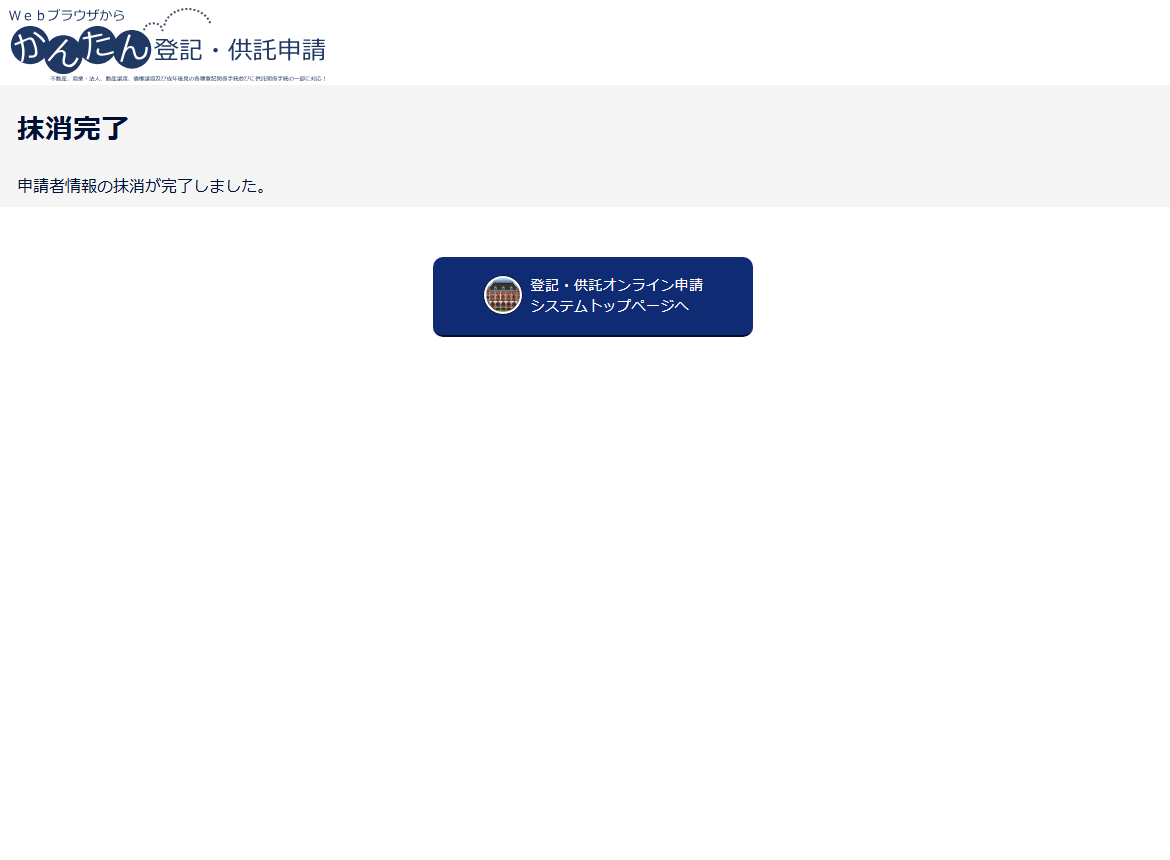 3 ログアウト及び申請者情報の抹消がされ、「抹消完了」画面が表示されます。